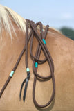 - Präzisere Signale: Die direkte Verbindung ans Halfter über eine Schlaufe ermöglicht direktere Hilfengebung und vermeidet verwirrende Signale. Zudem bremst es Schwingungen aus und schwingt auch in schnelleren Gangarten nicht schwer hin und her.
